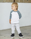 Bella+Canvas Toddler 3.6 Ounce 3/4 Sleeve Baseball T-Shirt. Side-seamed. Contrast raglan sleeves and neck trim. Tear Away Label. 52% Airlume combed and ringspun cotton, 48% polyester jersey, 40 single. 3.6 oz. fabric.