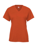 Badger Ladies 3.5 Ounce B-Core V-Neck T-Shirt. 100% Polyester moisture management/ antimicrobial performance fabric. Self-fabric collar. Double-needle hem with tack. Badger heat seal logo on left sleeve.