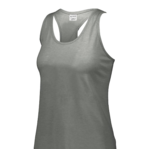 Augusta Ladies Triblend Tank. 3.8 ounce, 50% polyester/25% cotton/25% rayon tri-blend knit. Ladies' fit. Fits loose to body. Tear away label. Scoop neck. Racerback with keyhole. Contoured bottom